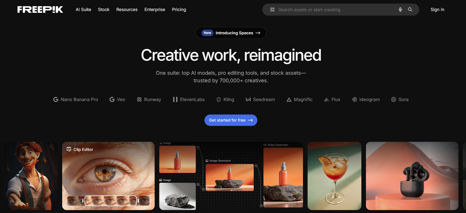 Freepik AI Suite gives graphic designers access to image generation, video, audio, and editing tools without having to juggle multiple platforms. The Image Generator covers a wide range of models (Google Imagen, Nano Banana, Seedream, Flux, Runway, Recraft) each suited to different design outputs: photorealistic product shots, typographic compositions, character-based illustrations, or quick concept drafts. You can also train AI styles, characters, and products to keep a consistent visual identity across assets. The Video Generator supports text-to-video and image-to-video work across multiple models, including Google Veo, Kling and Seedance, covering different durations and styles. The editing side handles background removal, upscaling, retouching, and image extender, and a Clip Editor for video with tools like video upscaling via Topaz and Magnific, video extension, lip sync, and more. For teams, Spaces provides a collaborative canvas to chain generation and editing steps in real time without switching tools.