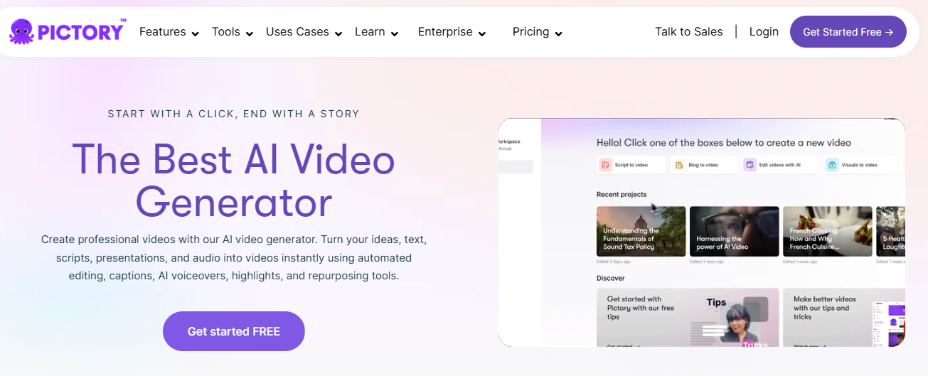 Pictory is designed for repurposing written content into videos. It automatically extracts key points from articles, blogs, or newsletters and generates short videos with visuals, captions, and voiceovers. This tool is perfect for small marketing teams looking to expand content reach across social media without creating videos from scratch.