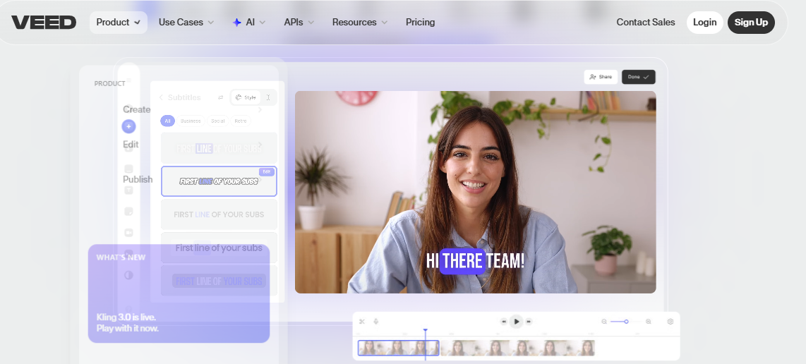 VEED focuses on editing and optimizing videos for social media platforms. Instead of generating videos entirely from scratch, it helps creators edit existing clips faster using AI-powered tools. One of the most useful features is automatic caption generation. Since many viewers watch videos without audio on social platforms, captions significantly increase engagement.